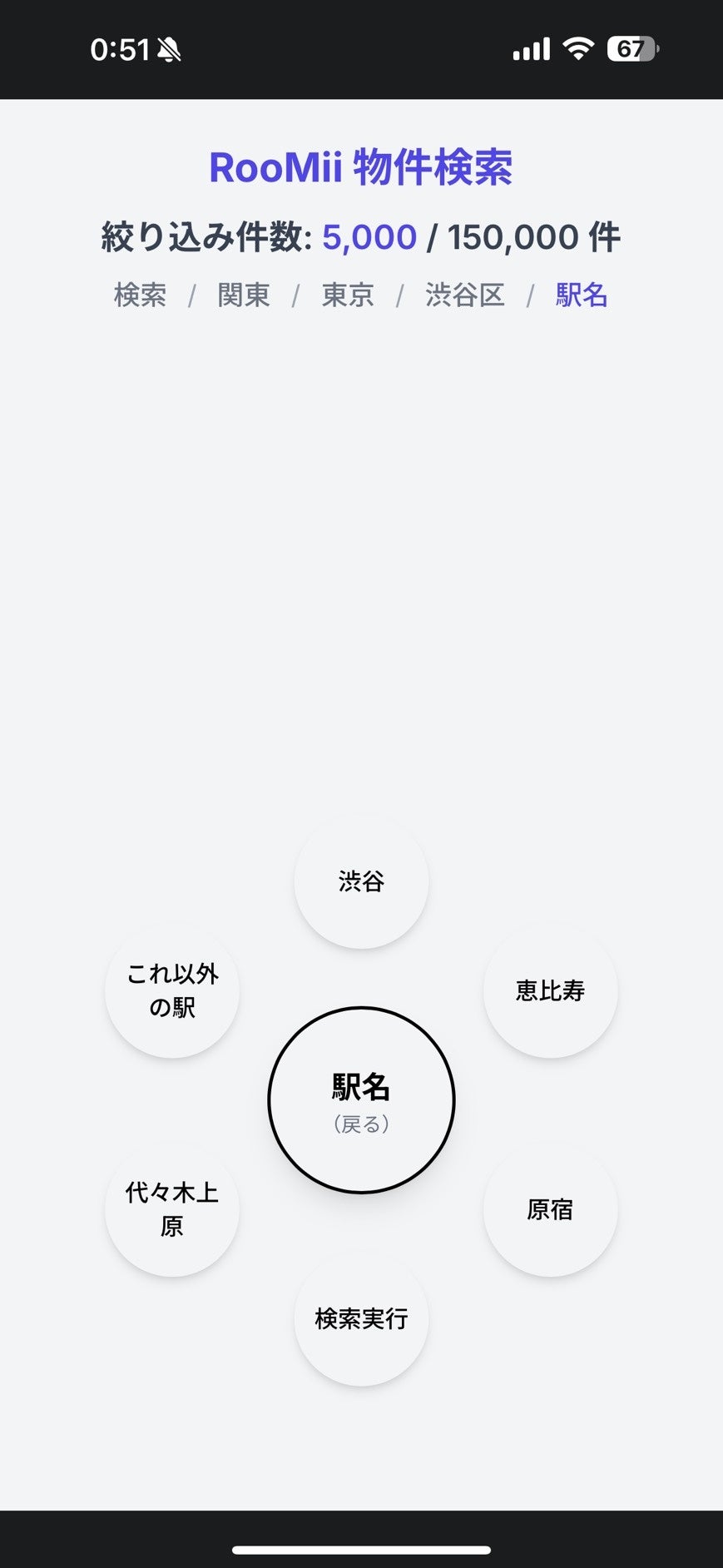 「渋谷区」→「駅名」とタップした第4階層の例。スクロールや文字入力なしで、タップ操作だけで「渋谷」「恵比寿」といった具体的な条件にたどり着ける。