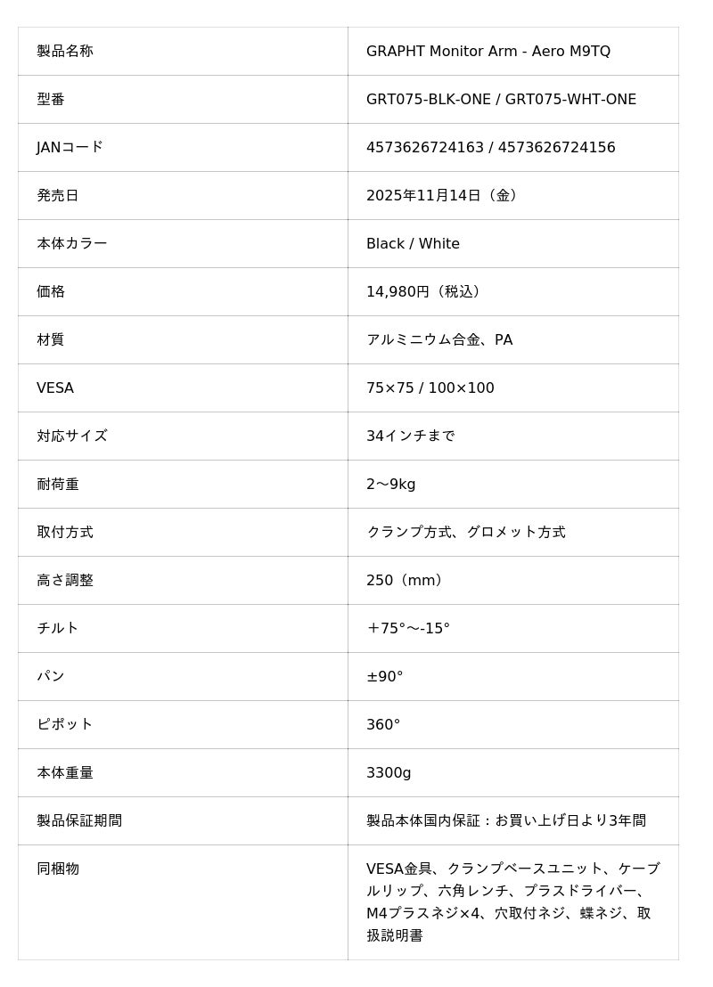 この度、毎日の当たり前をアップデートする『GRAPHT STANDARD』シリーズより、理想的なデスク環境を実現するモニターアーム『Aero』2製品、専用デスクプレートを、2025年11月14日(金)に発売します。いずれも、Black / Whiteの2色を展開。ゲーマーやクリエイターをはじめ、快適な作業環境を追求するすべてのユーザーに向けたラインアップです。