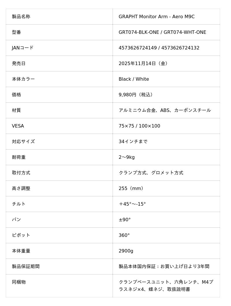 『GRAPHT Monitor Arm - Aero M9C』製品ページ