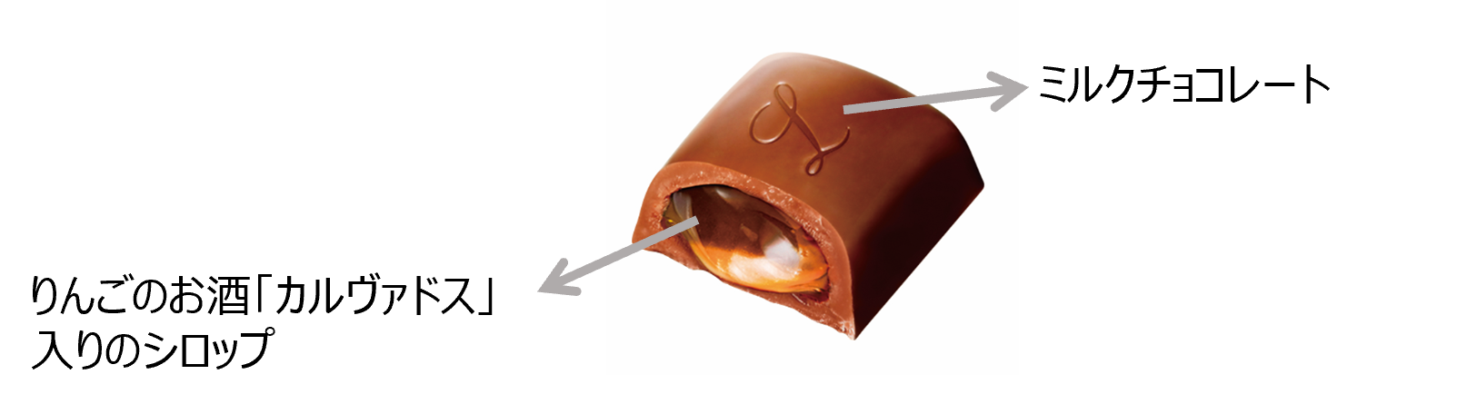 - フルーティーなりんごのお酒「カルヴァドス」を使用したシロップをたっぷりミルクチョコレートにとじ込めました。- 口いっぱいに広がる甘く芳醇なりんごのお酒とチョコの味わいをお楽しみください。