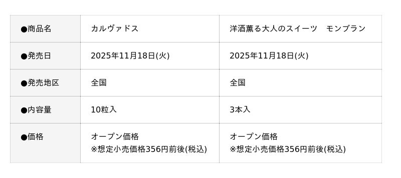 株式会社ロッテ(東京都新宿区、代表取締役社長執行役員:中島英樹、以下ロッテ)は、2025年11月18日(火)に、「ラミー」「バッカス」に代表されるロッテの洋酒チョコレートシリーズとして、「カルヴァドス」「洋酒薫る大人のスイーツ モンブラン」を冬季限定で発売いたします。「カルヴァドス」はファンの皆様からの待望のお声をうけ、6年ぶりの発売となります。昨年誕生の新シリーズ「洋酒薫る大人のスイーツ」からは、ご好評をいただいたモンブランが再登場です。節約疲れなどを背景に「プチ贅沢」ニーズが増加しています。癒しの手段として、夜にチョコやスイーツを楽しむ大人も増えています。チョコレートとお酒の絶妙なハーモニーで、優雅な気分と贅沢な時間をお楽しみください。