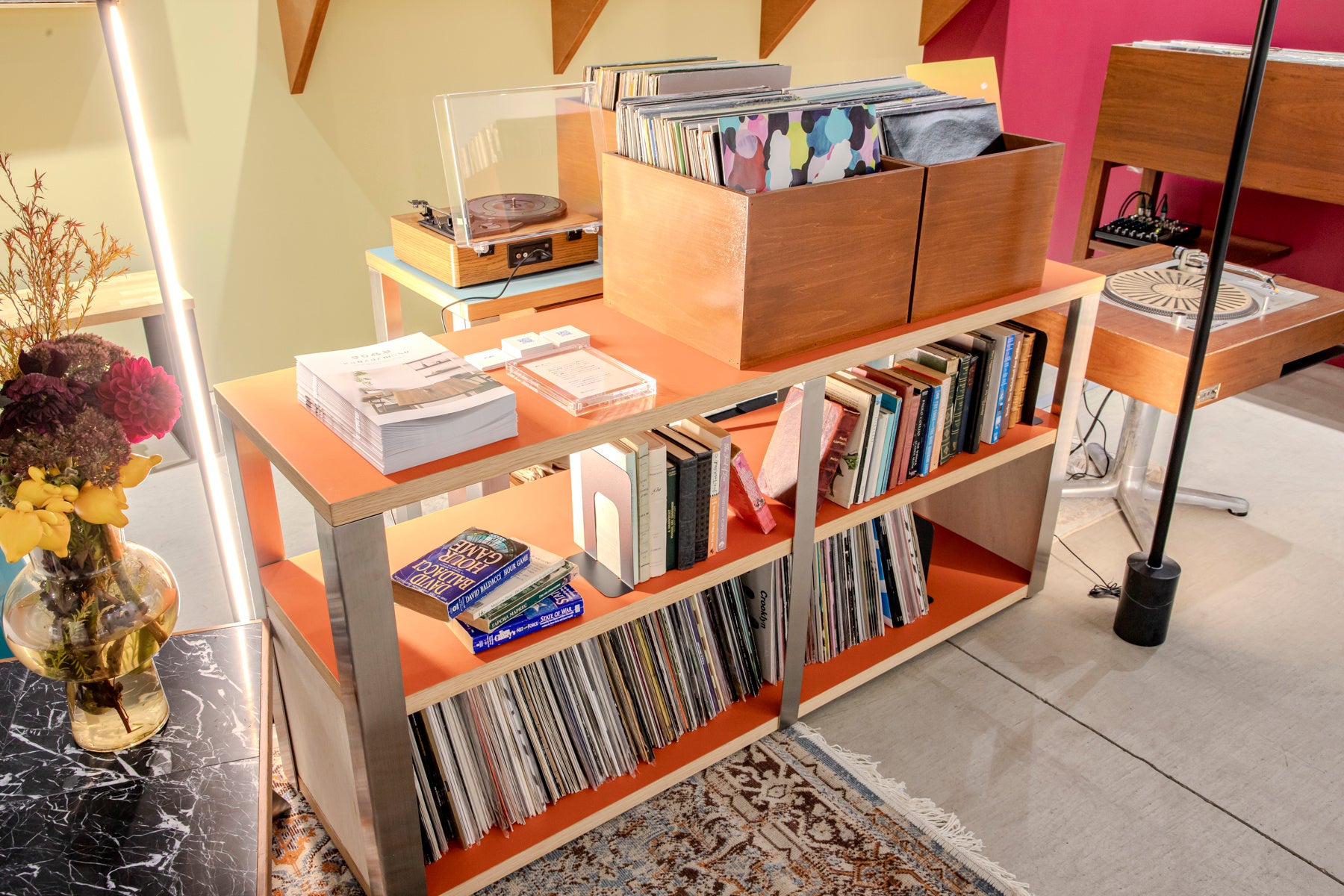 藤田氏の新作アートワーク、伝説的トラックメーカーNujabesがかつてオーナーを務めたレーベル/店舗「Tribe」のアナログ盤や視聴台とともに、色鮮やかな家具が響き合う空間。