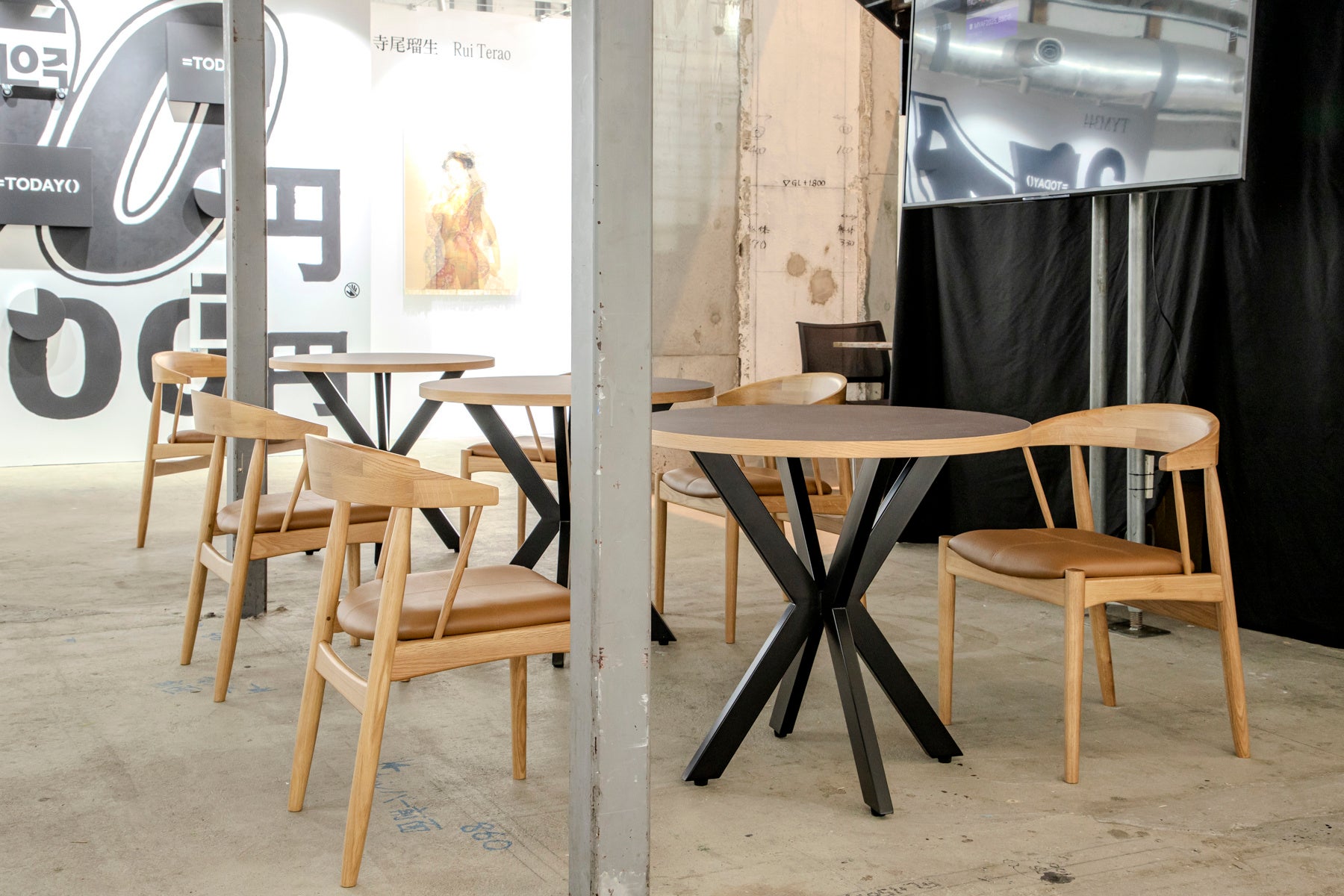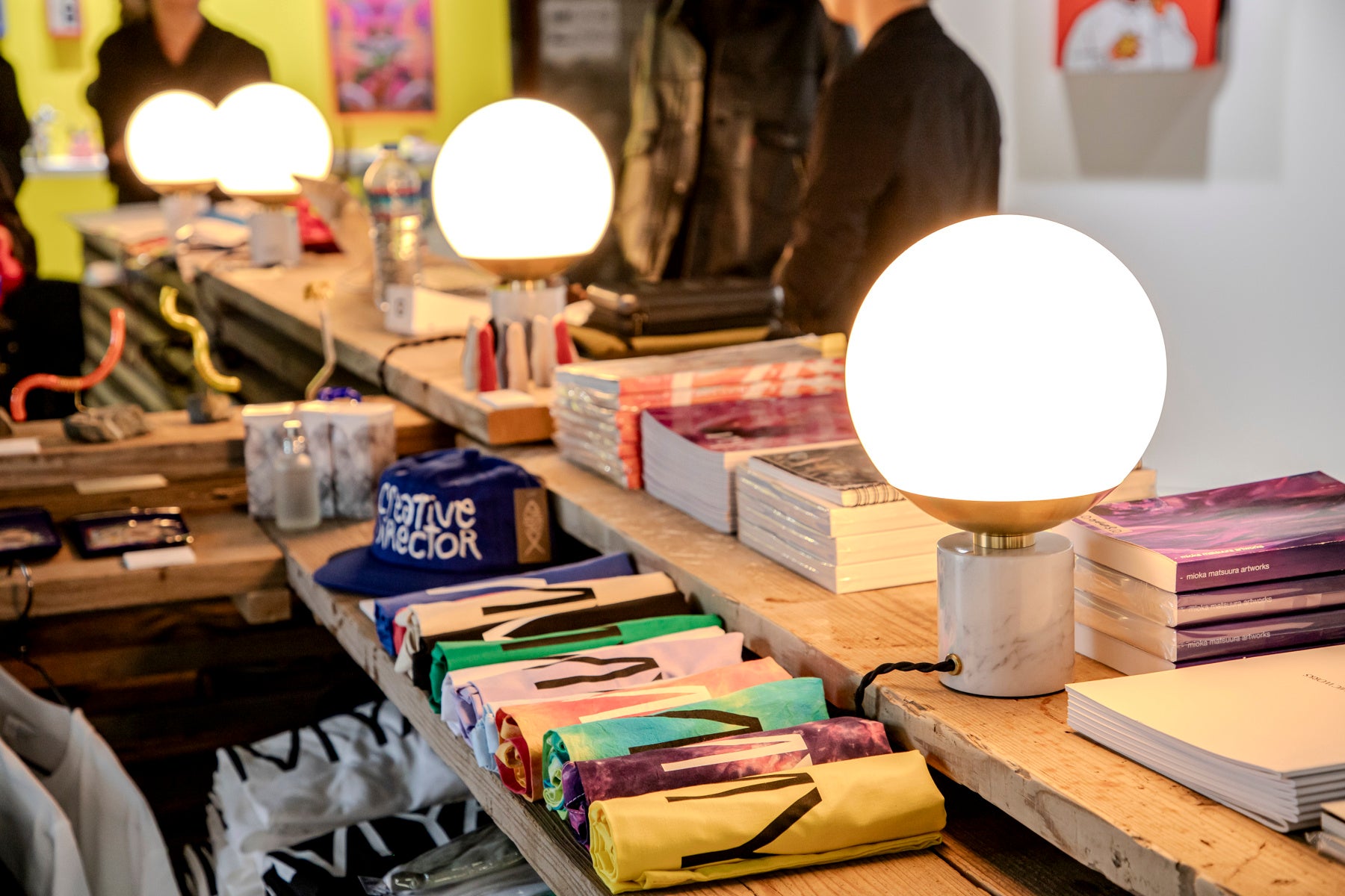 出展ブースに加え、会場内の各所でKANADEMONOの照明やカフェテーブルなどが採用され、来場者がアートと出会う空間を演出しました。▼会場入口の受付・決済カウンター