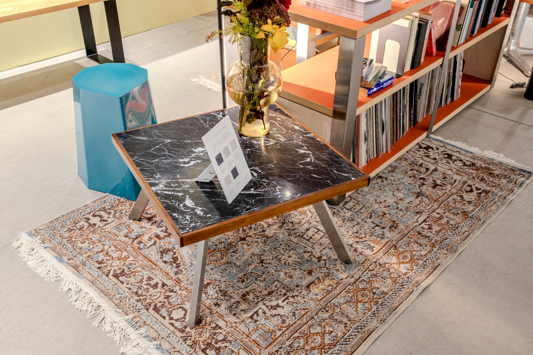 KANADEMONOのシグネチャーアイテム「THEシリーズ」からは、リノリウム天板を用いたストレージシェルフやスツールに加え、今冬発売予定の石天板を用いたローテーブルを先行展示しました。