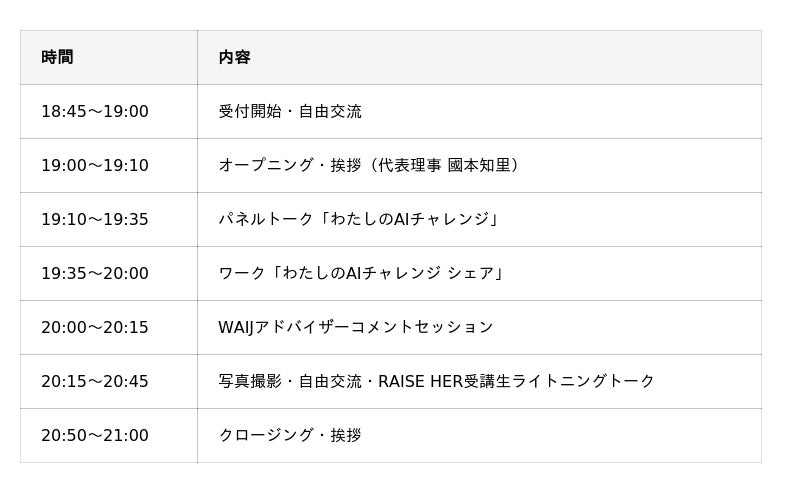 今回のイベントでは、これまでの歩みを振り返るとともに、「わたしのAIチャレンジ」をテーマにしたトークセッションや「RAISE HER」修了生によるピッチを通じて、“女性×AI”の実践と次の挑戦を発信します。