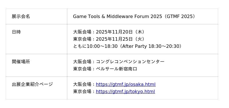 本展示会はゲーム制作を支える最新技術とサービスを一堂に集める、国内最大級の専門イベントです。