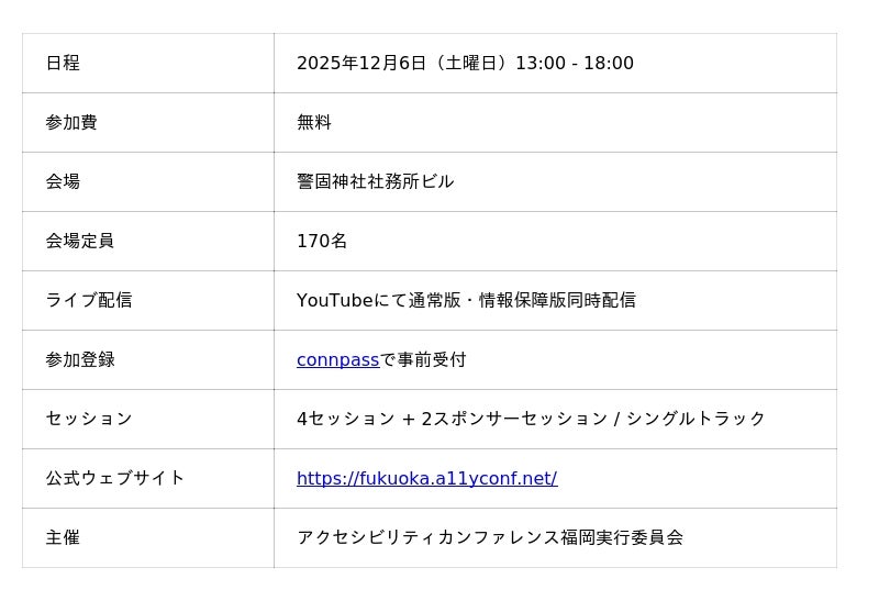 アクセシビリティカンファレンス福岡2025は、2025年12月6日(土)に福岡市で開催されるアクセシビリティをテーマとしたイベントです。