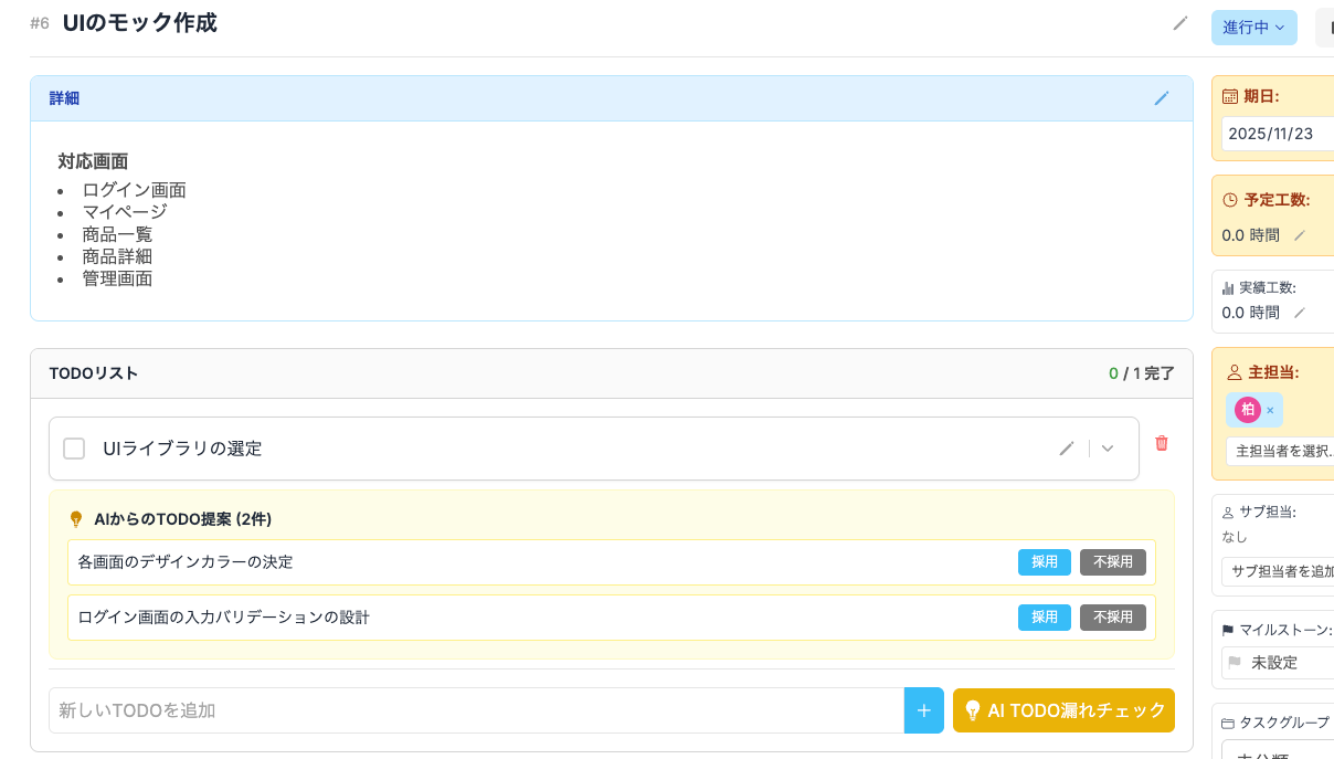 またAIによる支援機能を搭載し、工数見積やTODOの洗い出しをサポートします。