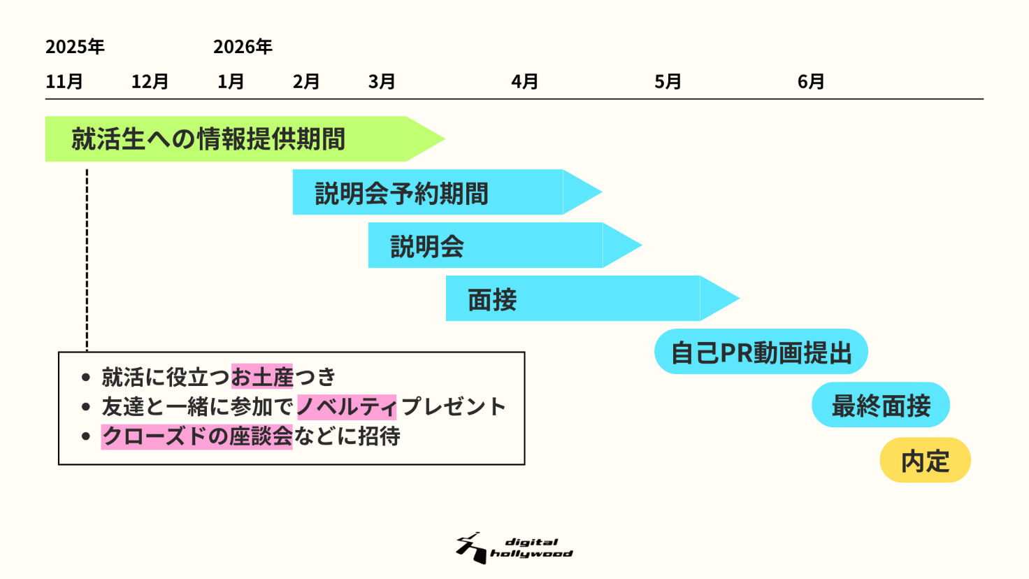 デジタルハリウッド株式会社は2026年3月より2027年卒向け会社説明会を開始します。それまでの3か月半程は就活生の皆さんへキャリア設計に役立つ情報提供や就活対策講座を展開します。先述の通り、この取り組み自体が社会に対するミッションであると同時に、当社にご関心をお寄せいただいた皆さんにとっても当社の事業や社風を総合的に理解していただきミスマッチを防ぐ役割を兼ねています。