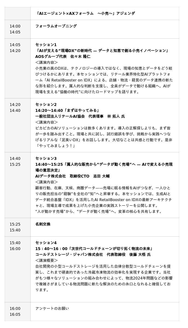 AIエージェントが動かす“小売AX革命” -属人知の壁を越える新時代へ、AIデータ社「AIエージェント×AXフォーラム ~小売~」 11/20開催