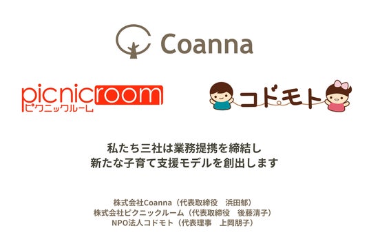 株式会社Coanna(本社:横浜市、代表取締役:浜田郁)は、株式会社ピクニックルーム(本社:横浜市、代表取締役:後藤清子)、NPO法人コドモト(本社:横浜市、代表理事:上岡朋子)と新たな子育て支援事業において業務提携を締結し、2025年2月より本格的に協働を開始しました。