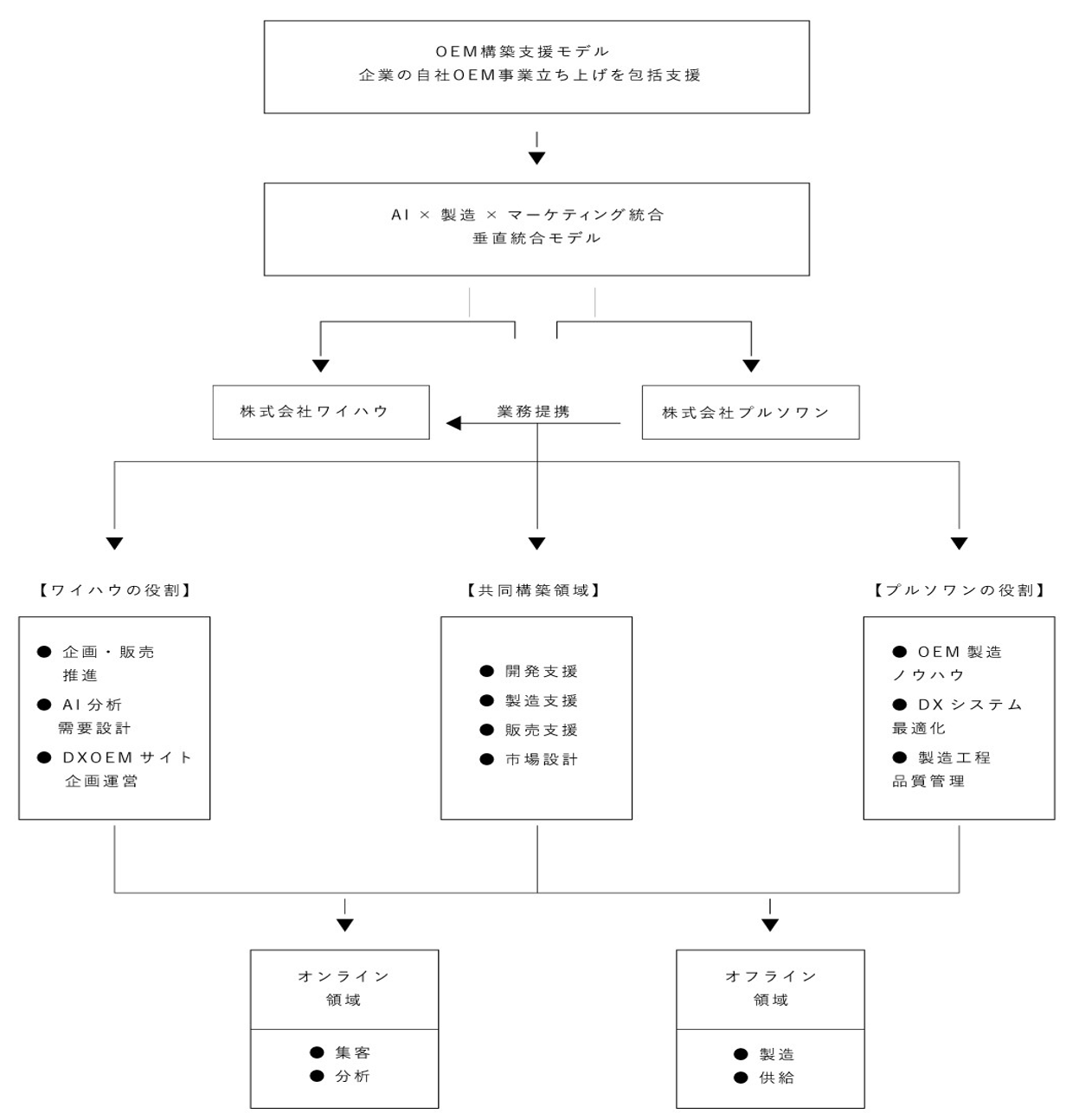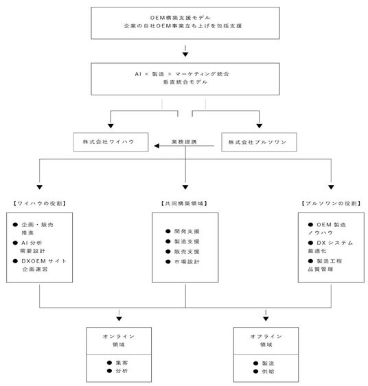 今後の展開ワイハウ社は、2025 年 11 月に化粧品 OEM 事業の公式サイト「DXOEM(https://www.dxoem.jp)」を公開し、OEM 受託・企画開発・原料調達・パッケージデザインなどの包括支援を開始します。今後はマーケティング支援領域との統合を進め、「AI×製造×マーケティング」を一体化した垂直統合型モデルとして事業展開を強化いたします。これにより、ワイハウ社はオンライン領域(集客・分析)とオフライン領域(製造・供給)の両面で収益基盤を確立し、企業の新規ブランド創出支援を中核事業として位置づけます。