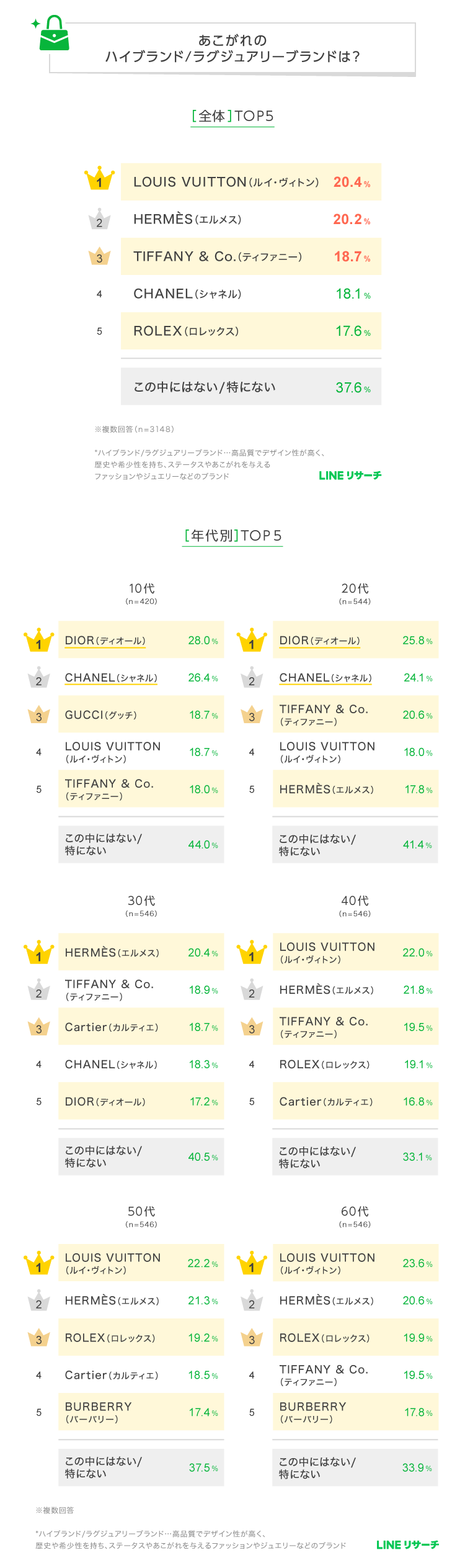 LINEリサーチ、全国の15~69歳の男女を対象に、あこがれのハイブランド/ラグジュアリーブランドに関する調査を実施