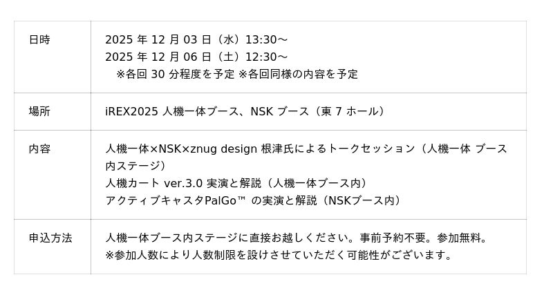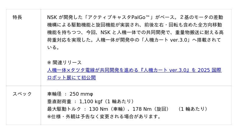 ・関連プレスリリース(2025 年 09 月 02 日公表):日本精工×人機一体、iREX2025に向けて『アクティブキャスタPalGo 高荷重タイプ』の共同開発プロジェクトを加速 | 日本精工(NSK)