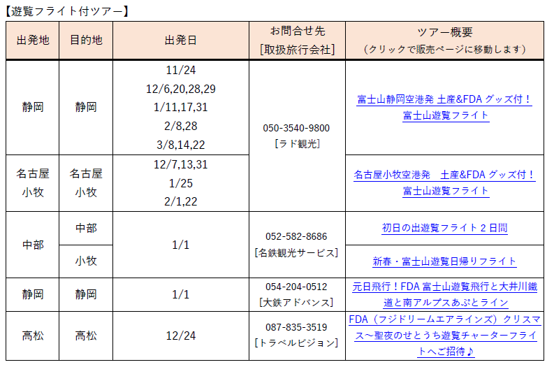 ※上記は、現在一般販売している旅行ツアーの一部となります。全てのチャーター便・遊覧フライトの運航予定を記載しているものではありませんのでご了承ください。