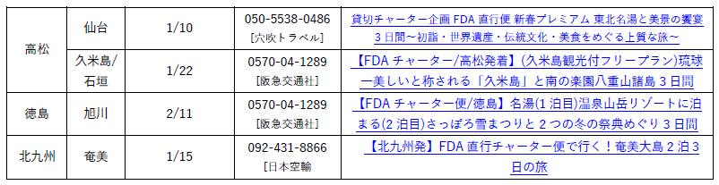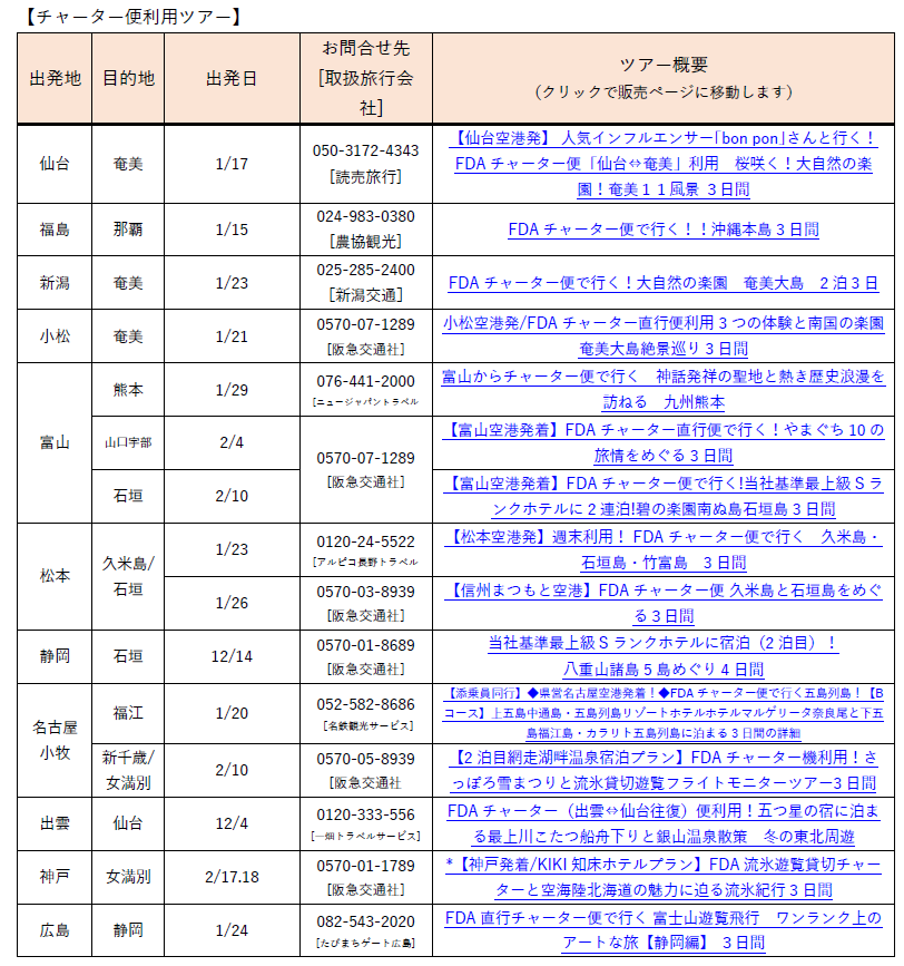 現在募集中の、FDAチャーター便を利用した旅行ツアーのご案内です。