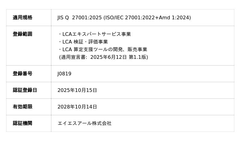 株式会社LCAエキスパートセンター(本社:東京都千代田区、代表取締役社長:神崎昌之、以下「当社」)は、2025年10月、情報セキュリティマネジメントシステム(ISMS)の国際規格「JIS Q 27001:2025 (ISO/IEC 27001:2022+Amd 1:2024)」の認証を取得したことをお知らせいたします。