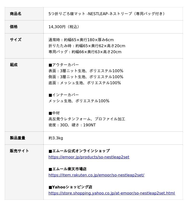 「身体に合った寝る・座る・たたむ」を提供する健康家具ブランドEMOORを展開する株式会社エムール(東京都立川市:代表取締役 高橋 幸司/以下エムール)は、2025年11月11日より『5つ折りごろ寝マット -NESTLEAP-(以下、ネストリープごろ寝マット)』の販売を開始しました。