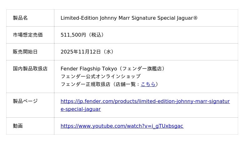 フェンダー ミュージカル インストゥルメンツ コーポレーション(所在地:米国カリフォルニア州、CEO:アンディ・ムーニー、以下FMIC)は、英国を代表するギタリスト、ジョニー・マーとの最新コラボレーションモデル『Fender(R) Limited-Edition Johnny Marr Signature Special Jaguar(R)』を発表しました。本製品は、2025年11月12日(水)より販売を開始します。