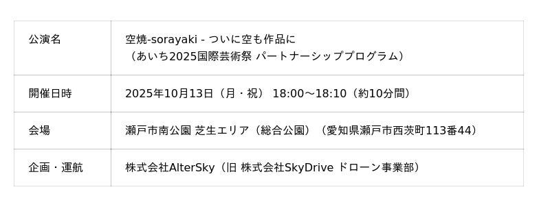 物流ドローン及びドローンショーの企画・運航サービスを提供する株式会社AlterSky(本社:愛知県豊田市、代表取締役CEO 村井宏行、以下「AlterSky」)は、2025年10月13日(月・祝)に、国際芸術祭あいち2025のパートナーシッププログラム(※1)として、愛知県瀬戸市の瀬戸市南公園 芝生エリア(総合公園)にて、ドローンショー『空焼-sorayaki - ついに空も作品に』を実施したことをお知らせいたします。