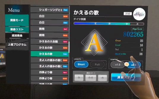 音を正確に弾くことで得点が加算され、演奏後には合計得点と演奏ランク(S・A・B・C)が表示されます。