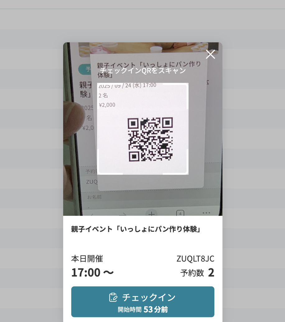 こうした課題を解決するために開発したのが、QRコードチェックイン機能です。事前に予約した参加者は表示されたQRコードを提示するだけで受付が完了し、来場確認と予約内容の照合を同時に実現できます。