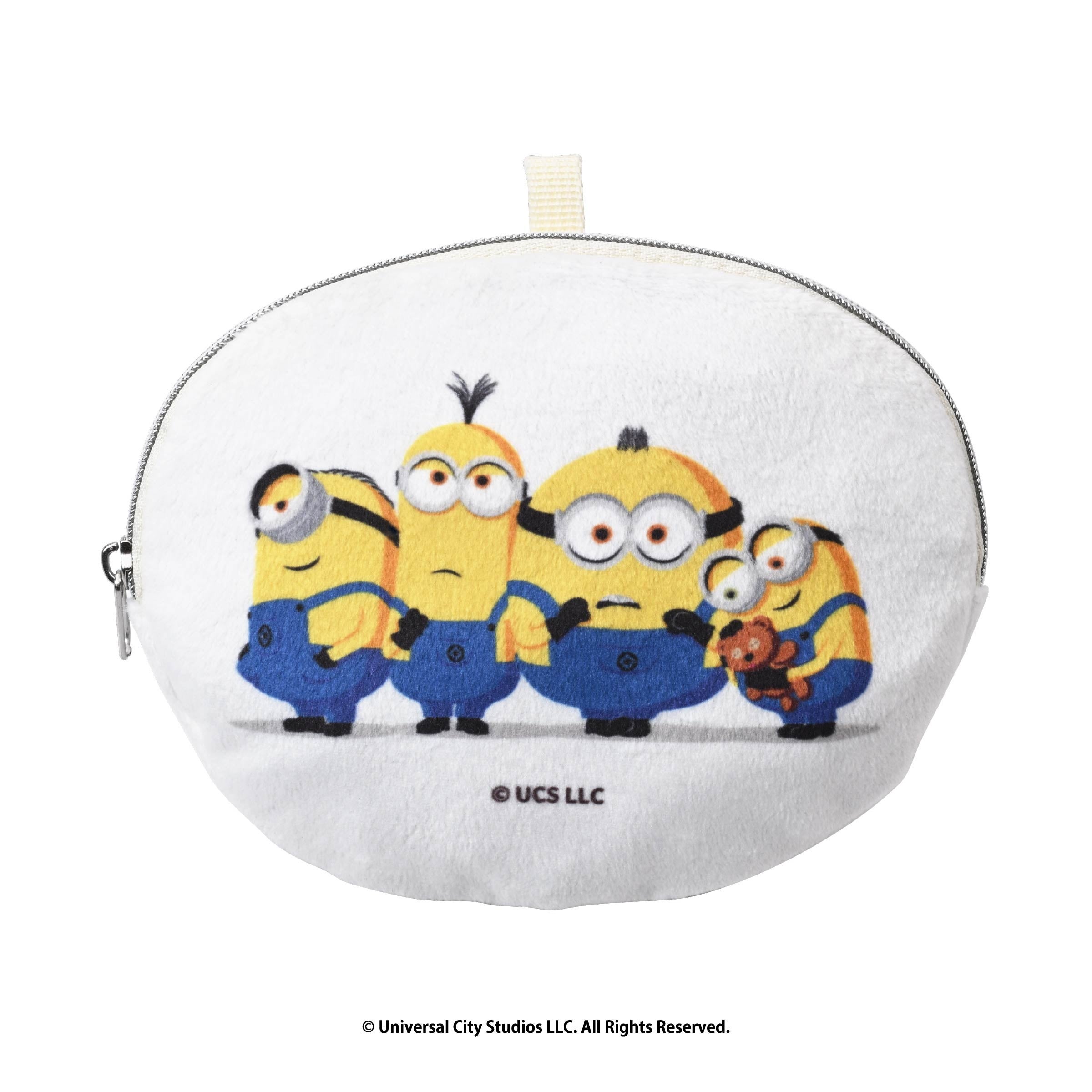 丸型の「ポーチ」は、仲良しのミニオンたちが集まった姿をデザインしました。特に、お気に入りの「ティム」を大切に抱える「ボブ」の姿や、ぎゅっと密着する4人の姿がポイントです。幅約15cm×高さ約12cmの持ち歩きやすいサイズ感で、コスメや文房具などの小物収納にぴったりです。