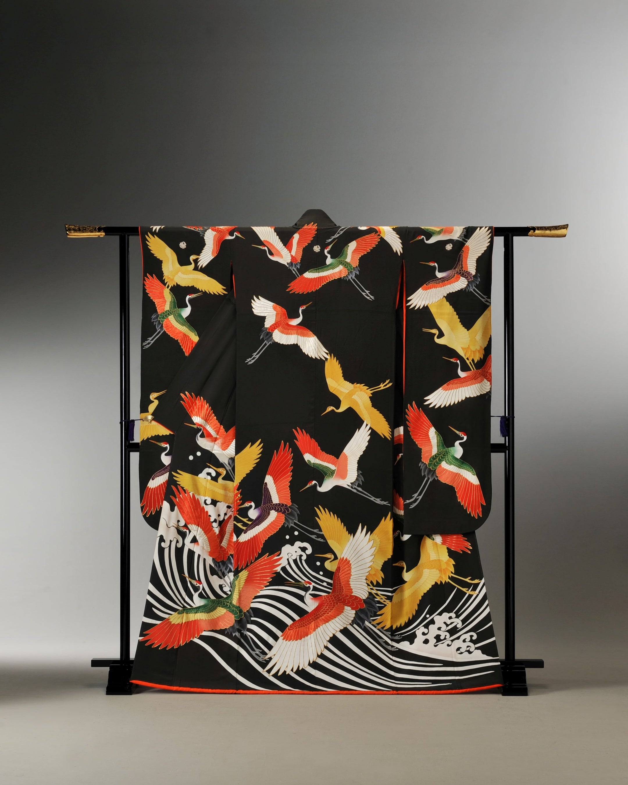 【特別衣裳展示】 14代西村總左衛門夫人婚礼衣裳 「黒縮緬地 大鶴模様振袖」