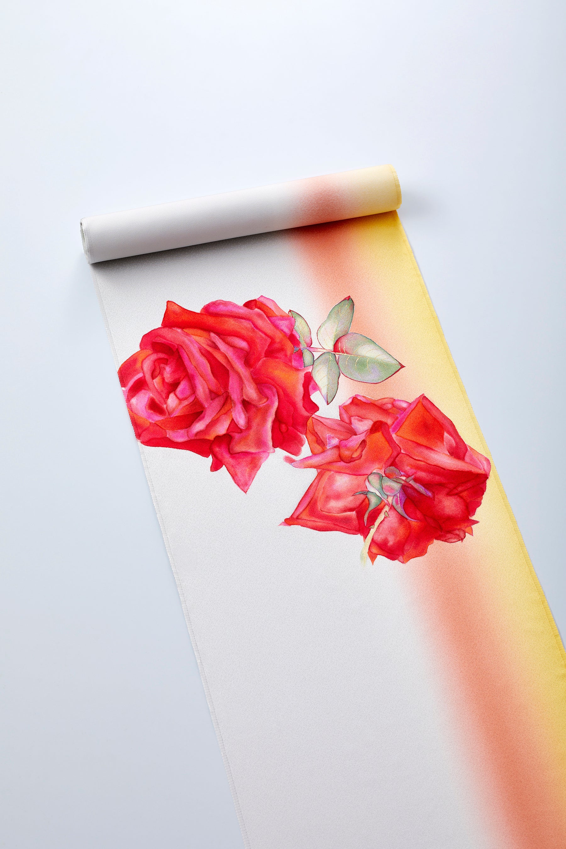 また、今回の新しい取組みとして、新進気鋭の日本画家・岩田壮平氏とのコラボレーションによる、感度の高い新たな友禅美の作品を19種類発表いたします。本展のために岩田壮平氏が描き下ろした原画をもとに、日本画の技法「たらしこみ」を千總が友禅染で再現しました。圧倒的な花の存在感と生命力が宿るきものは、まさに“着るアート”。伝統と革新が響き合う、唯一無二の美の世界を体感いただけます。
