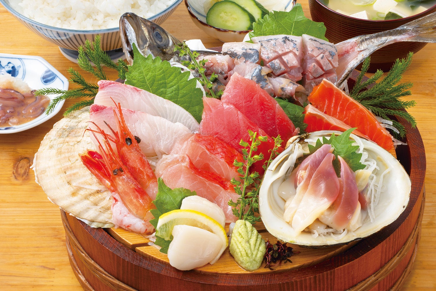 ランチタイムも、海鮮居酒屋らしいボリューム満点、食べ応えバツグンの男前メニューが勢ぞろい。マグロなどのゴロゴロぶつ切り刺身を酢飯の上に豪快にのせた「ぶつ切り刺身まかない丼」(通常1,280円→半額640円)や、鮮魚の刺身8種に塩辛がついた1日10食限定の「水産大漁刺身定食」(通常1,980円)。マグロぶつが付いた日替わりの煮魚、焼き魚定食(通常 各1,200円)といった、コストパフォーマンス抜群のメニューを揃えています。