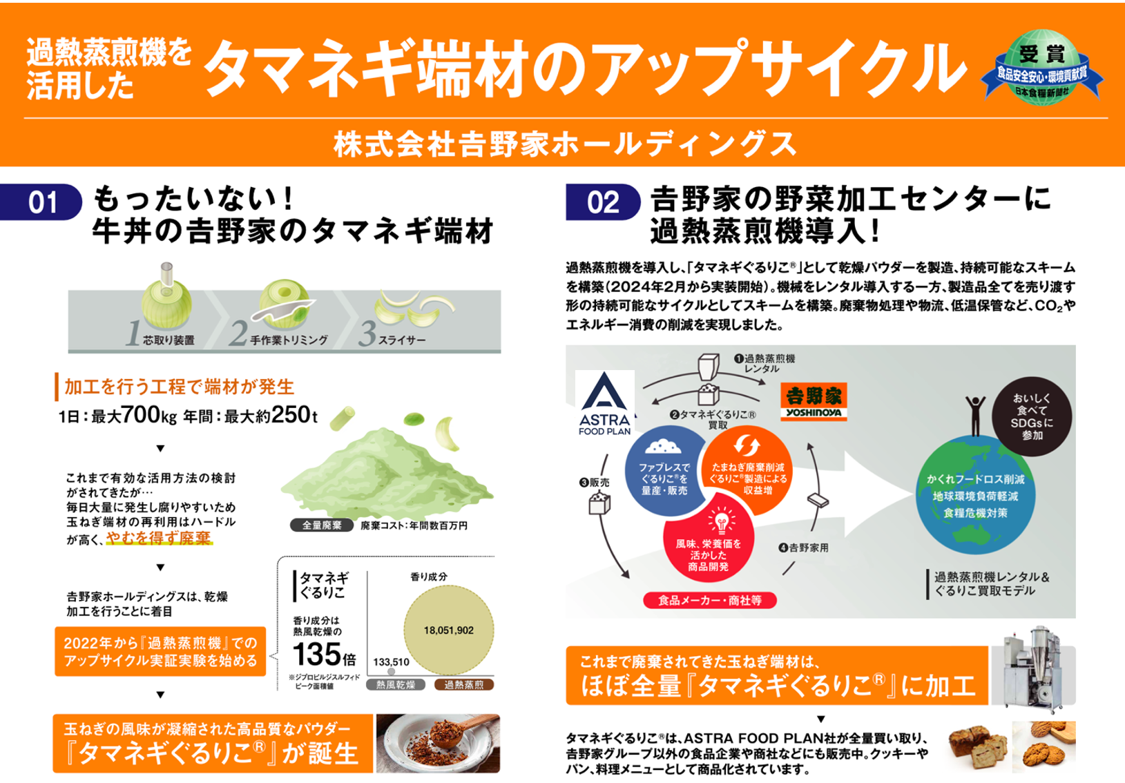 本取り組みは、吉野家の牛丼の主要食材である玉ねぎの加工工程で発生する端材を乾燥・粉末化し、新たな食品へとアップサイクルすることで、食品廃棄物の削減と事業価値の向上を両立した点、また、外食産業における新たな方向性を示した点が高く評価されました。