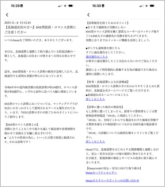 こうした継続的な安全対策に加え、警察庁や各都道府県警察、国民生活センターなどとの定期的な情報交換を実施しており、このたび千葉県警察、和歌山県警察に続き、北海道警察と連携して「with」「Omiai」ユーザーを対象にSNS型投資・ロマンス詐欺の手口や対策を紹介し、注意喚起を促す啓発活動の実施に至りました。
