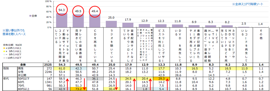 「オーディオプレーヤー」、「カセットテープ等」も高めで、聴く方法が幅広い。