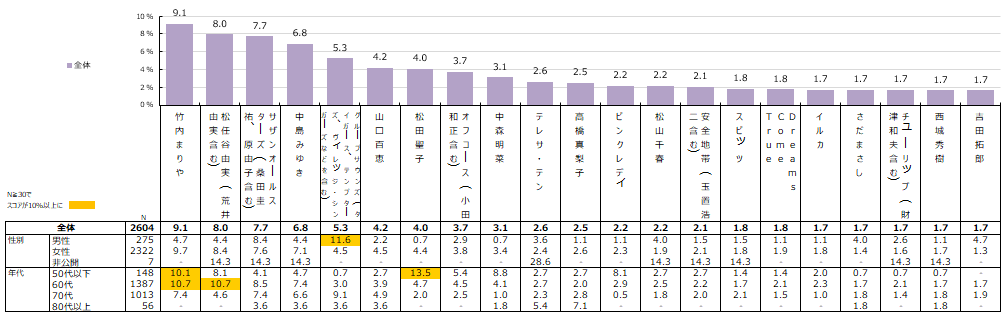 ・上位は「竹内まりや」、「松任谷由実」、「サザンオールスターズ」、「中島みゆき」の順。