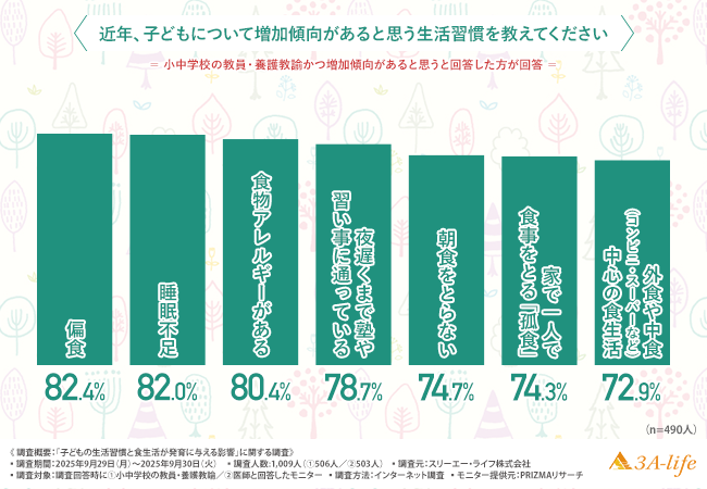子どもの「偏食」「食物アレルギー」「睡眠不足」「夜遅くまでの塾や習い事」など、食と生活リズムに起因する習慣の乱れが「増加している」との認識が広く共有されているようです。