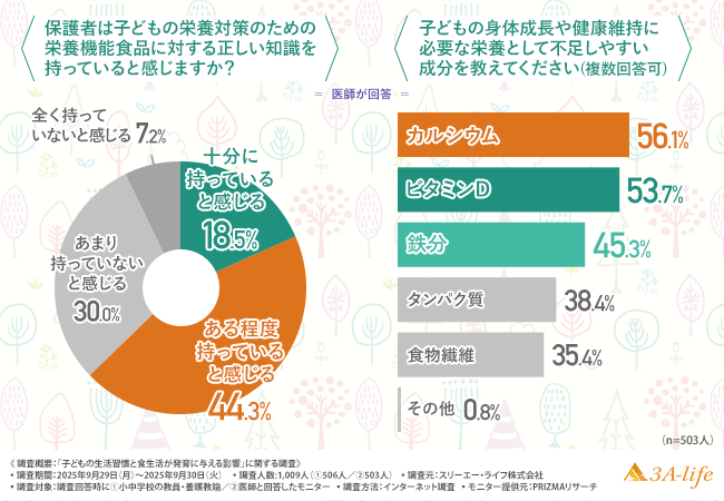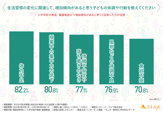 そこで今回、スリーエー・ライフ株式会社(https://www.3a-life.com/)は、1.小中学校の教員・養護教諭/2.医師を対象に、「子どもの生活習慣と食生活が発育に与える影響」に関する調査を行いました。