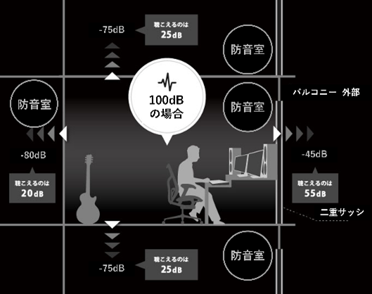 ※4 第三者機関「株式会社OTO技術研究所」の遮音測定検討報告書に基づき 算出(記載の数値は設計図面等に基づき、TRACK両国・TRACK向ヶ丘遊園・TRACK八丁堀の防音室の500Hz帯域の遮音性能 を測定・検討したものであり、性能を保証するものではありません。)