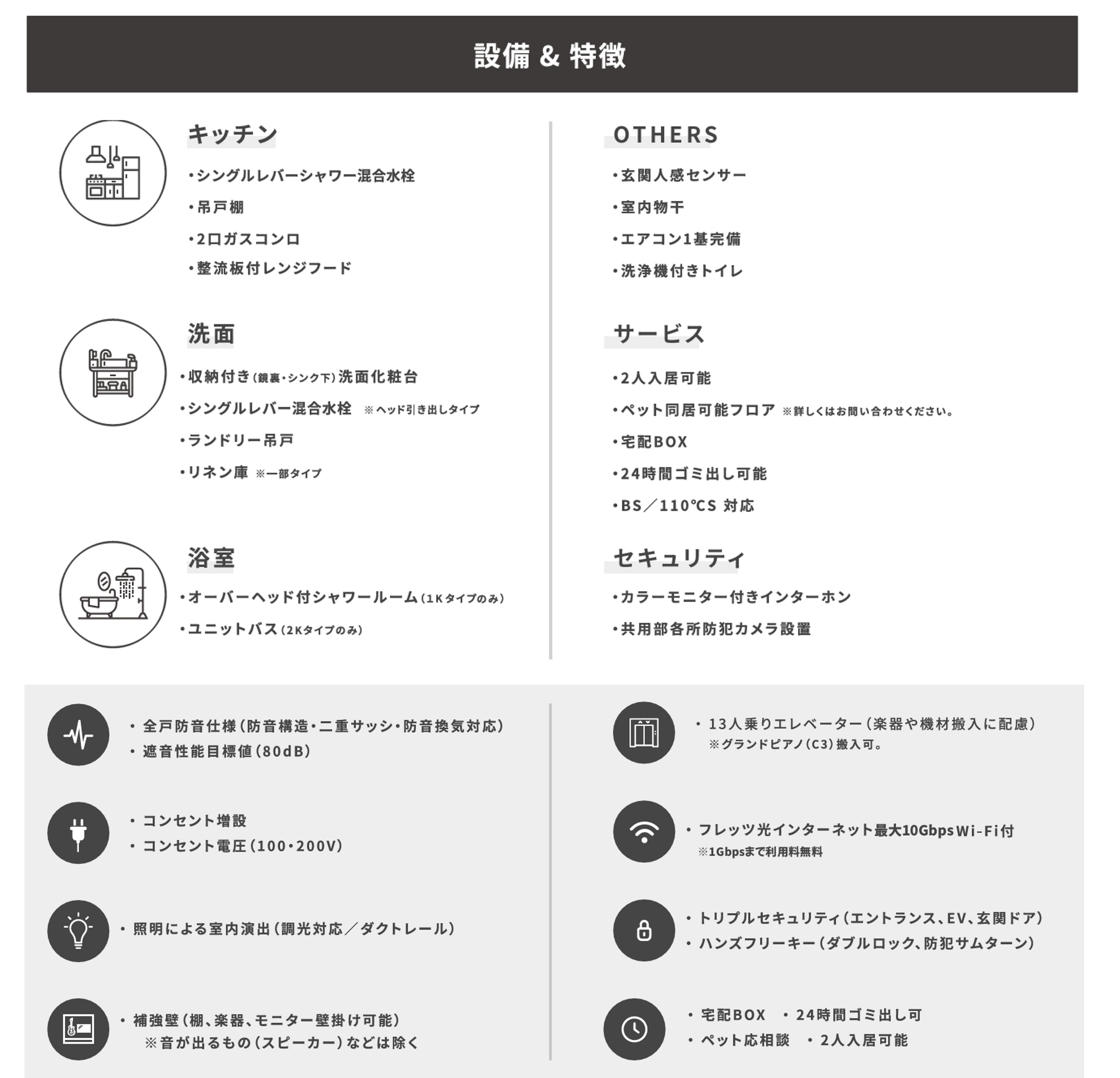 本物件では、次世代クリエイターの理想の住まいを目指した設備をご用意しております。全戸防音仕様としているため、時間を気にせず集中して音楽制作に励むことができます。また、欧米の機材などに対応する100V・200Vのコンセント電圧を配置した設備仕様のほか、フレッツ光インターネットを最大10Gbps※2まで利用可能です。
