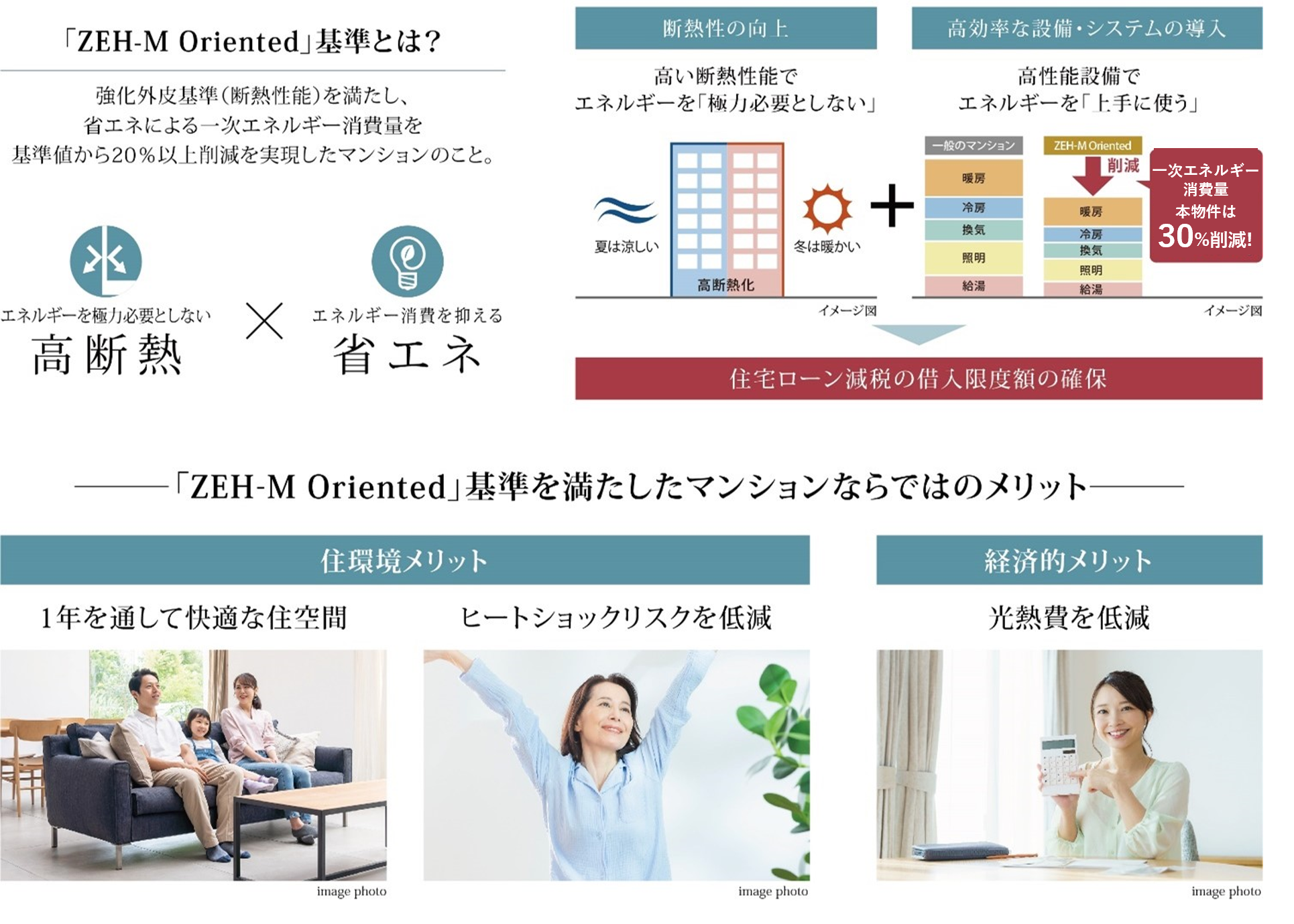 本物件は、強化外皮基準(断熱性能)を満たし、省エネによる一次エネルギー消費量を基準値から30%以上削減(本物件では31%削減)を実現したマンションとして、「ZEH-M Oriented」基準を満たします。また、建築物省エネ法に基づく建築物省エネルギー性能表示制度「BELS(ベルス)」による第三者認証では☆4※6、7を取得しています。