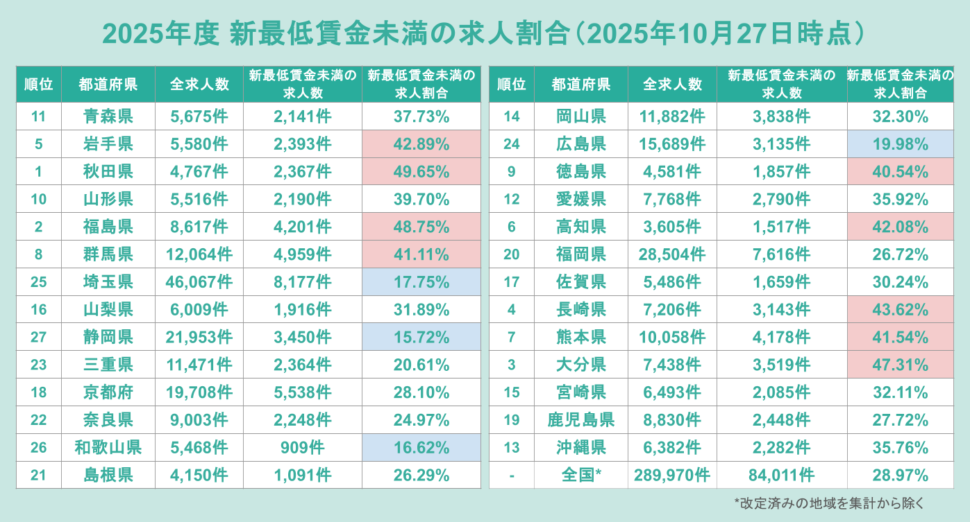 改定後最低賃金に満たない求人は全国で28.97%、9月から17.41ポイント改善【2025年10月度 都道府県別 新最低賃金未満の求人割合レポート】