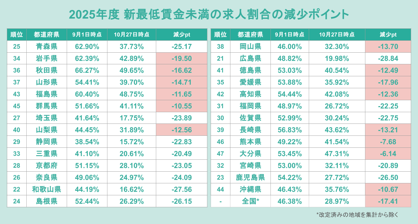・改定済みの地域を除き、2025年度の改定後最低賃金に満たない求人は全国で28.97%となり、9月時点(46.38%)から17.41pt改善。改定の反映が全国的に進んでいることが明らかに