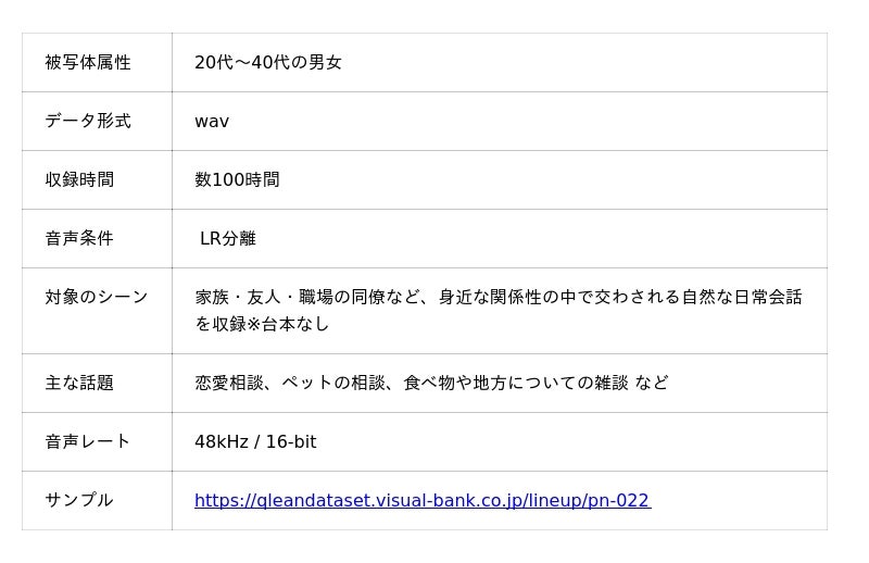Visual Bank株式会社(東京都港区、代表取締役CEO 永井真之、以下「Visual Bank」)は、傘下の株式会社アマナイメージズを通じて展開するAI学習用データソリューション『Qlean Dataset(キュリンデータセット)』において、『日本語・2話者・日常会話音声コーパスデータセット』の提供を開始しました。