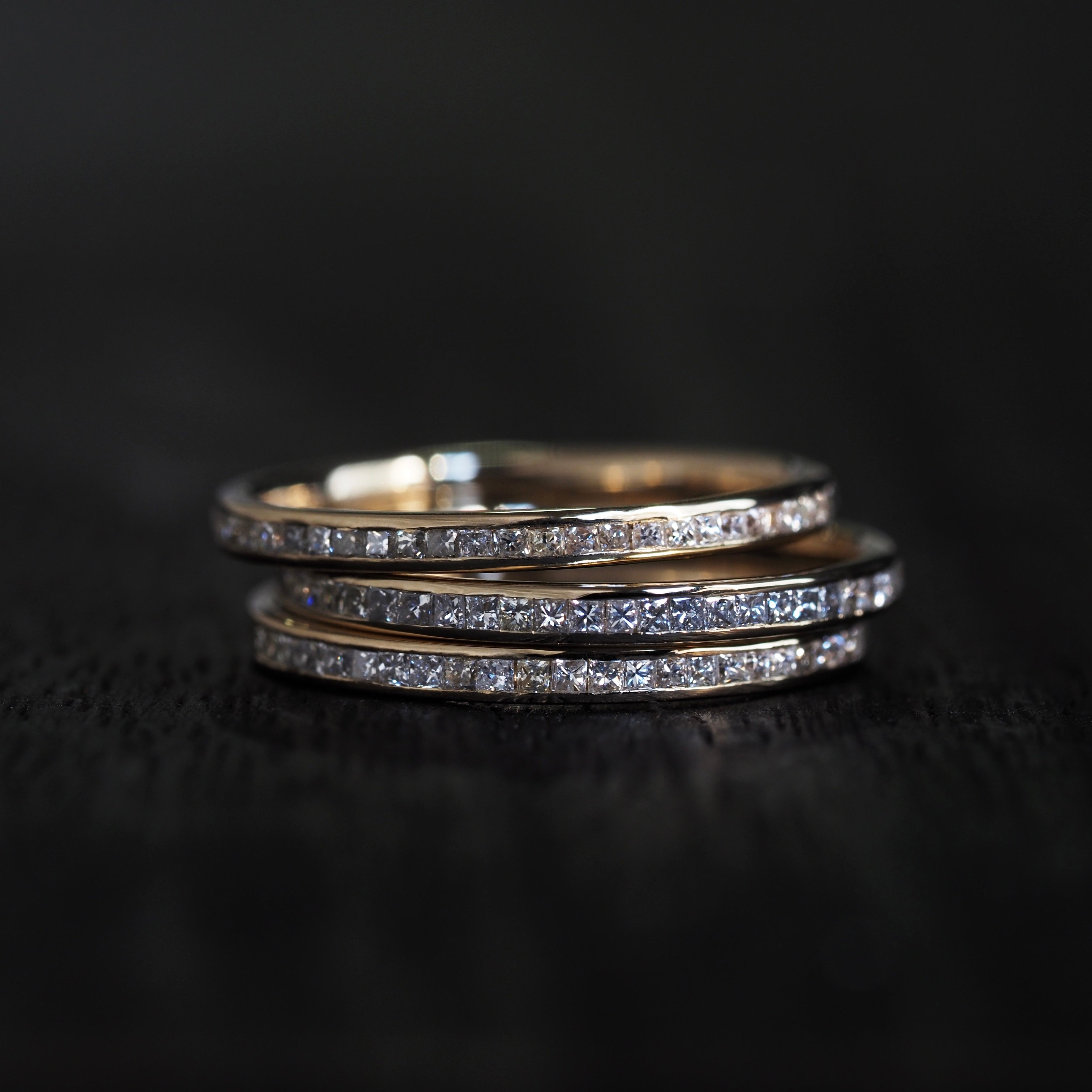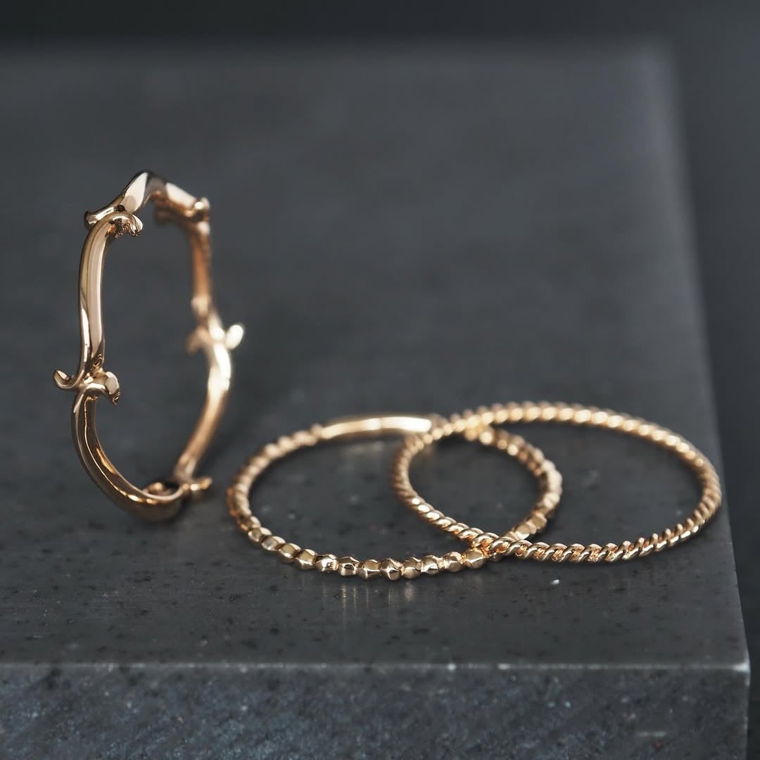 ロープのような立体感を一周に施したリング、小粒の石が一列に並ぶ繊細なデザイン、そしてツタが伸びるように流れるラインの3種。