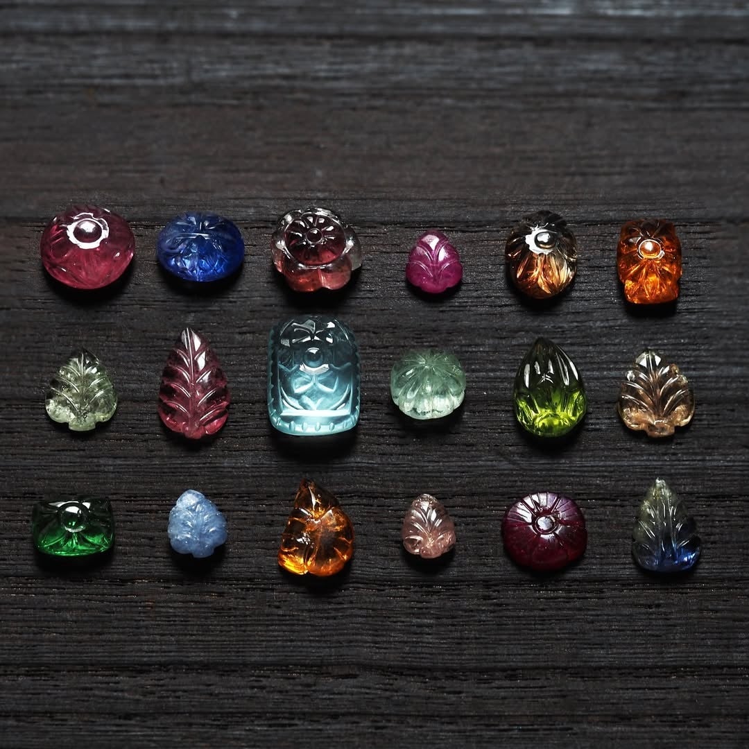 カーヴィングとは、宝石そのものに彫りを施し、立体的な表情と温もりを生み出す宝石彫刻の装飾技法です。インド・ジャイプールで直接買い付けた彫刻入りのルースは、どれも一点もの。花や葉をモチーフにした伝統的な手彫り細工が、光を受けて立体的に輝きます。同じ石でも彫りの深さや線の数が異なり、ひとつとして同じものはありません。カーヴィングの持つ立体感と透けるような色合いは、角度によって表情を変え、自然の息吹を思わせる温かみがあります。
