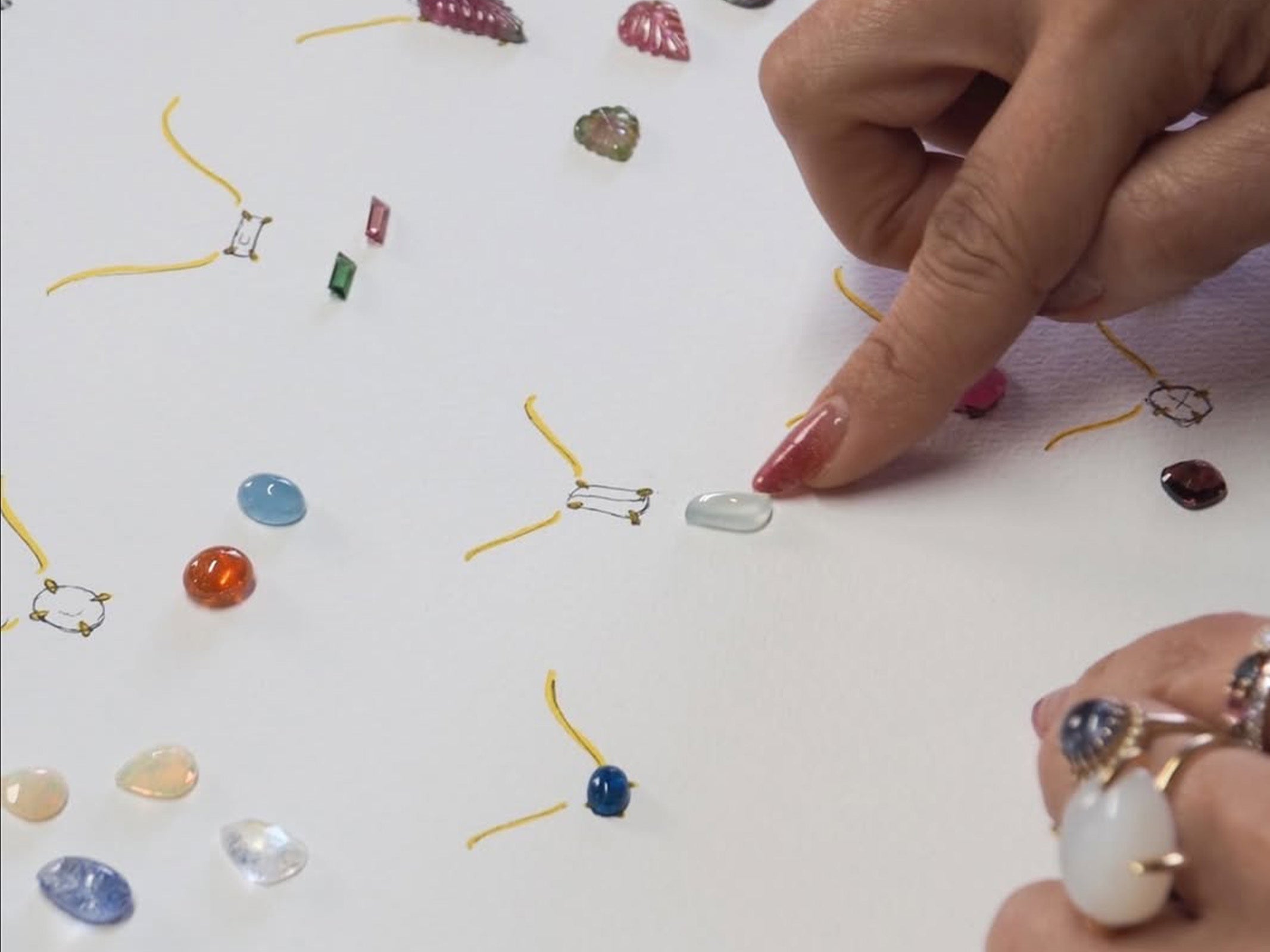 その個性ゆえに仕立てが難しいとされる素材ですが、Caravanでは宮本たちがスケッチを描きながら、実際の石を合わせ、わかりやすくデザインをご提案いたします。