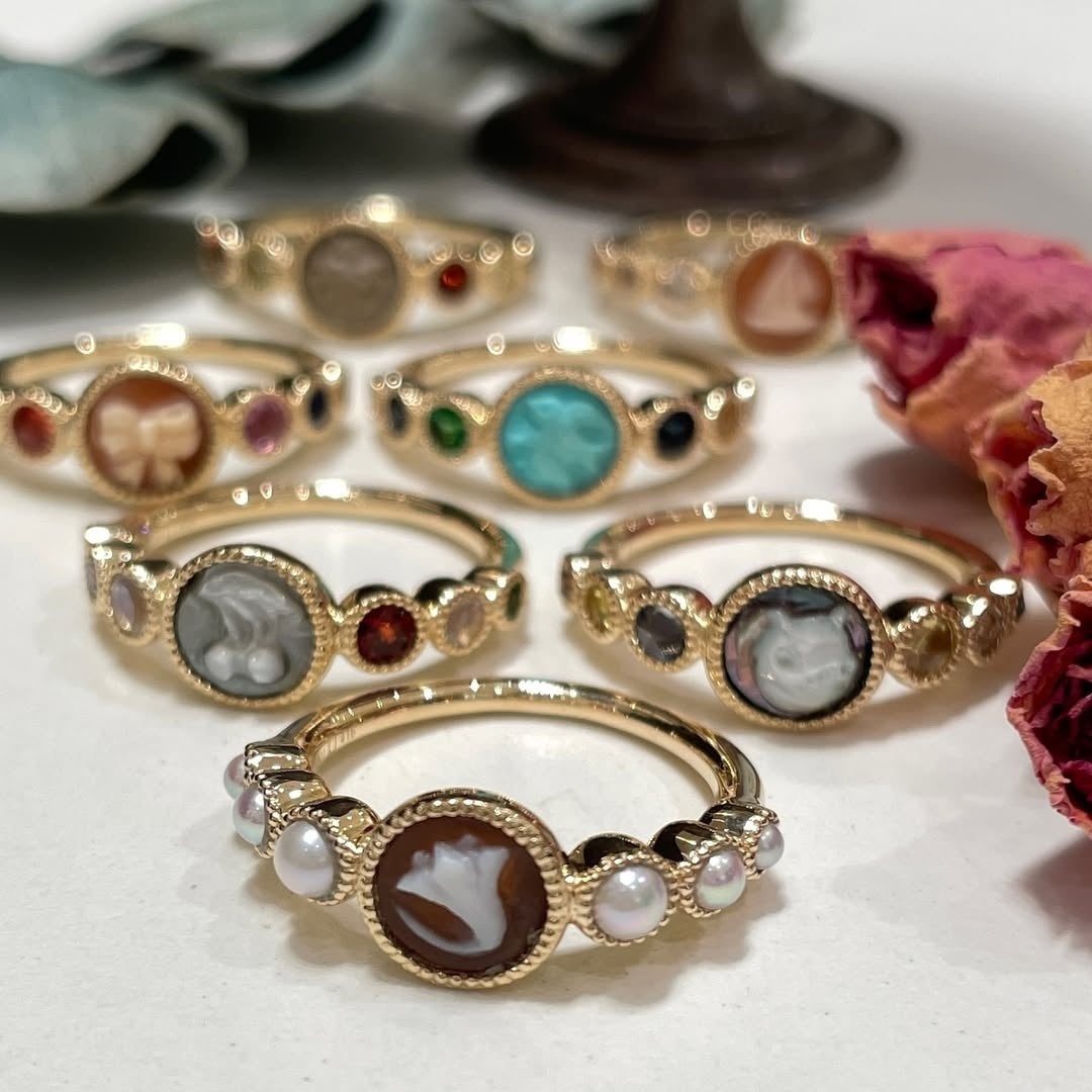 シェルの種類も多彩で、定番のコルネリアンやサードニクスのほか、黒蝶貝を用いたカメオも展開。螺鈿細工のような独特の光沢を持ち、落ち着いた華やかさを添えます。