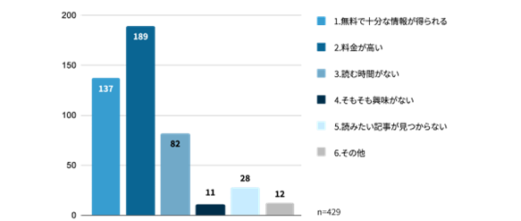日経電子版を含めた有料ニュースサービスの利用状況について質問したところ「現在利用中」が38.5%、「過去に利用したことがある」が21.0%でした。「利用したことがない」と答えた約4割の回答者に利用しない理由を聞いたところ「料金が高い」「無料で十分」との回答が上位に入りました。会社での福利厚生・人材育成に導入を期待する声を反映しています。