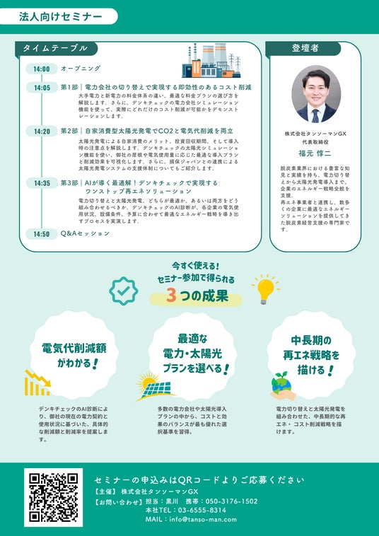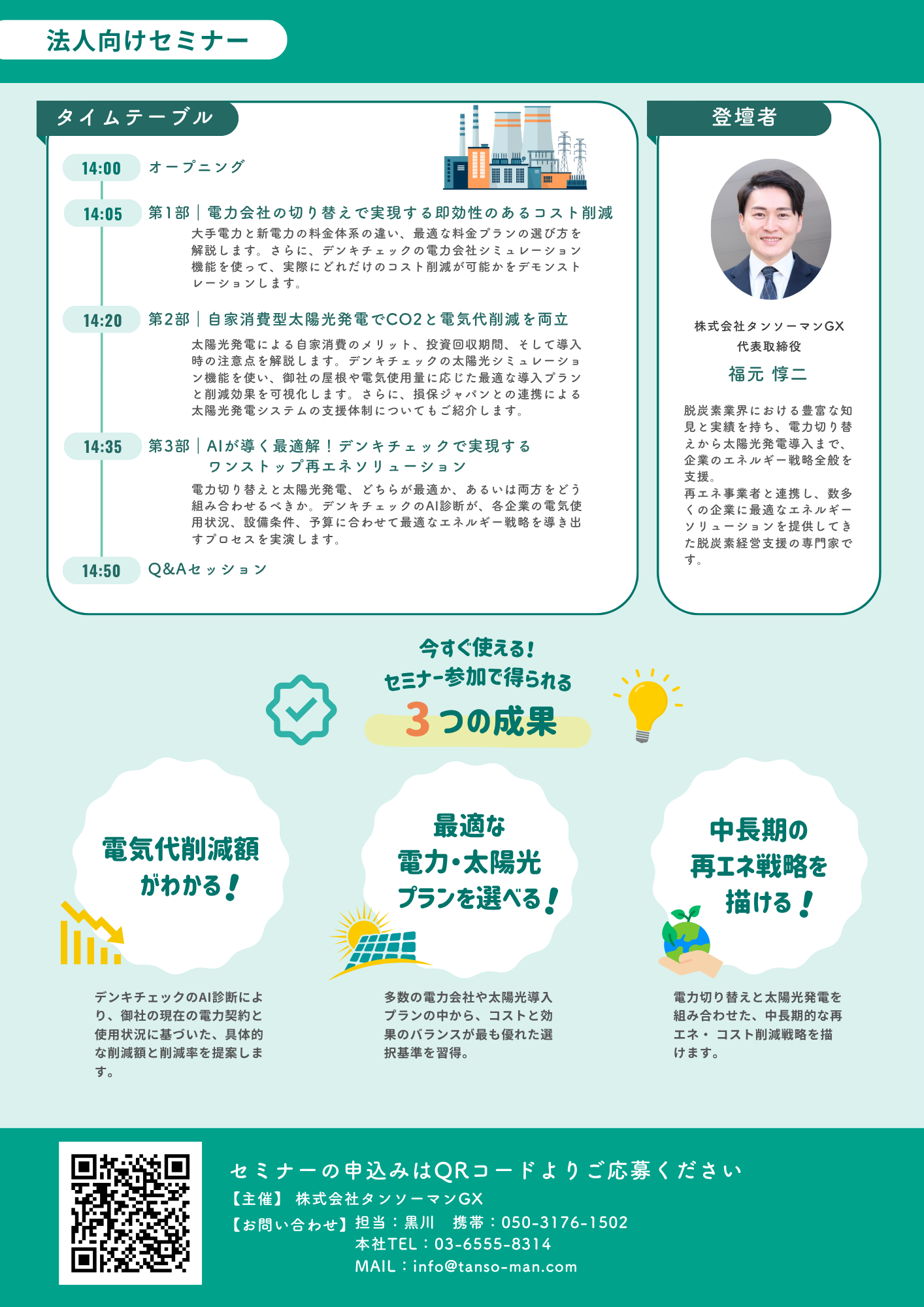 株式会社タンソーマンGX(本社:東京都品川区、代表取締役:福元 惇二)は、2025年11月26日(水)に、東京都に事業所を構える法人・企業様を対象とした無料セミナー「AI診断で電気の見直し」を、TKP新宿カンファレンスセンターおよびオンライン(Zoomウェビナー)でのハイブリッド形式にて開催いたします。