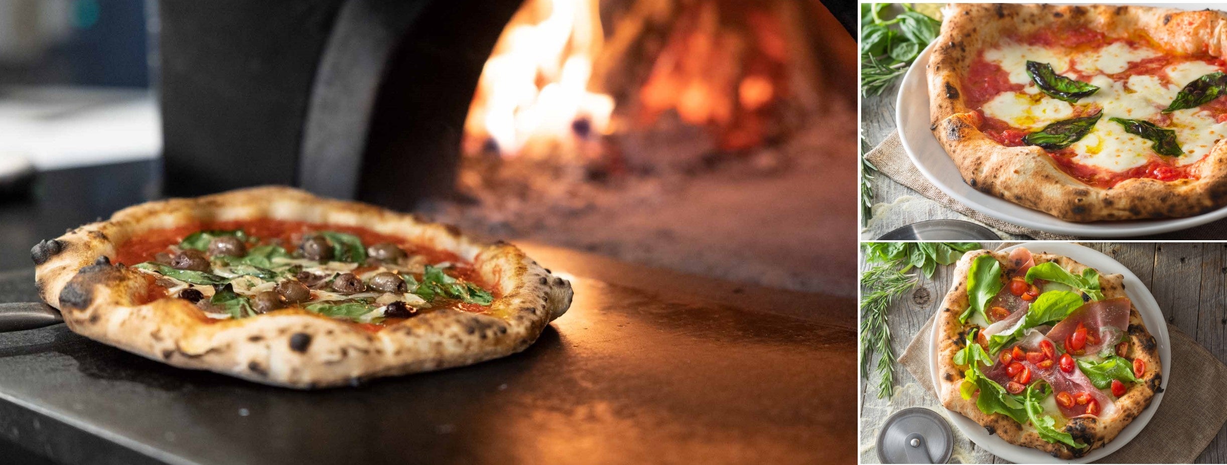 画像左:ジャンニ・アクント製の薪窯で焼き上げるナポリピッツァ 画像右上:マルゲリータ 画像右下:プロシュートとチェリートマトとルッコラ