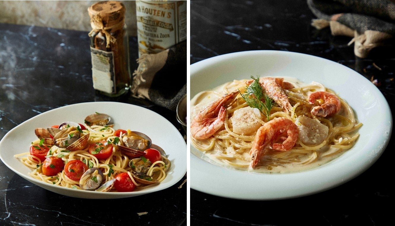 画像左:活あさりとチェリートマトのボンゴレマッキャート 画像右:海老と帆立のアマルフィ風 レモンクリーム